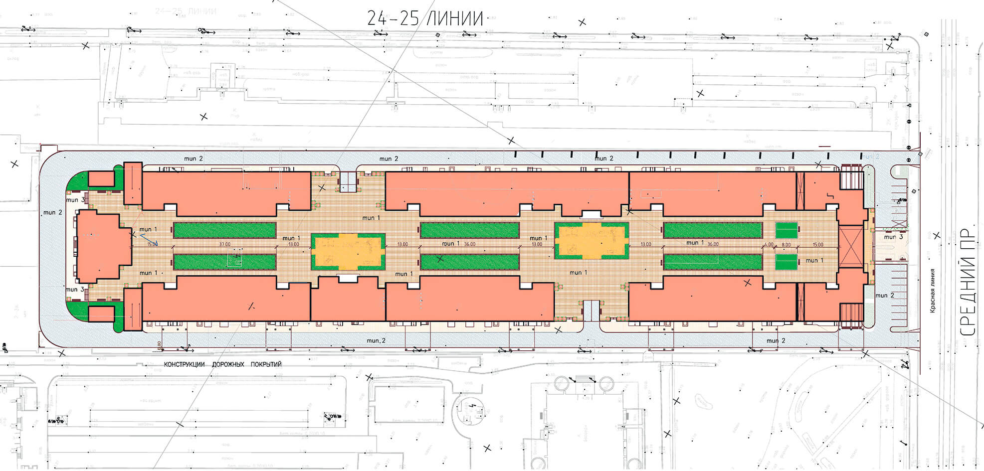 Комплекс имеет П-образную конфигурацию, благодаря чему обладает закрытой внутренней территорией (8.100 кв. м.), на которой расположена внутренняя инфраструктура.